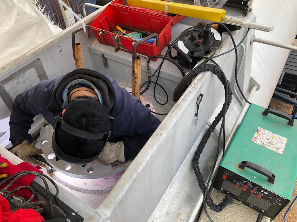 Trabajo de reparación mediante soldadura en una cisterna de aluminio la cual es usada para transporte internacional de productos.
